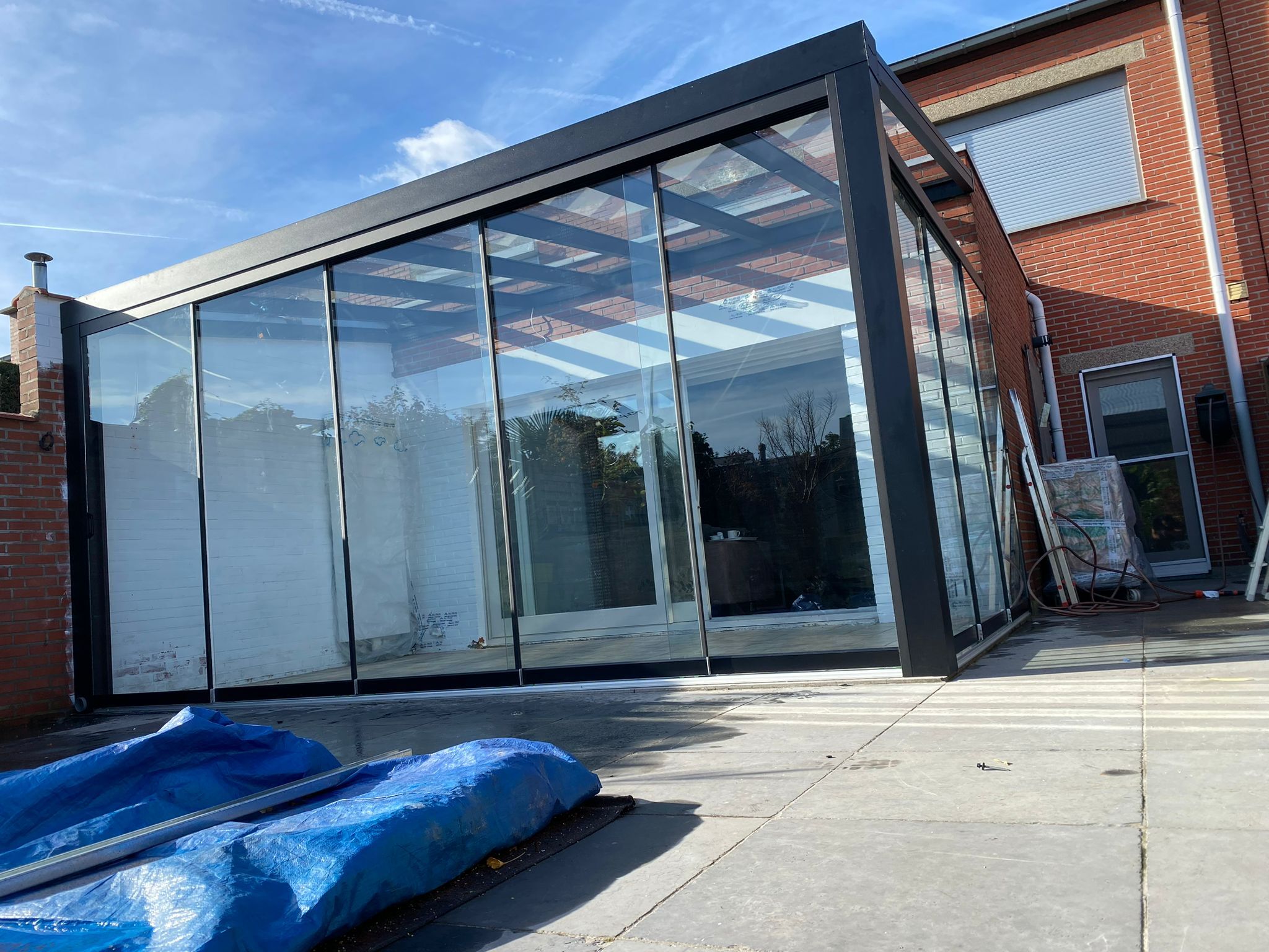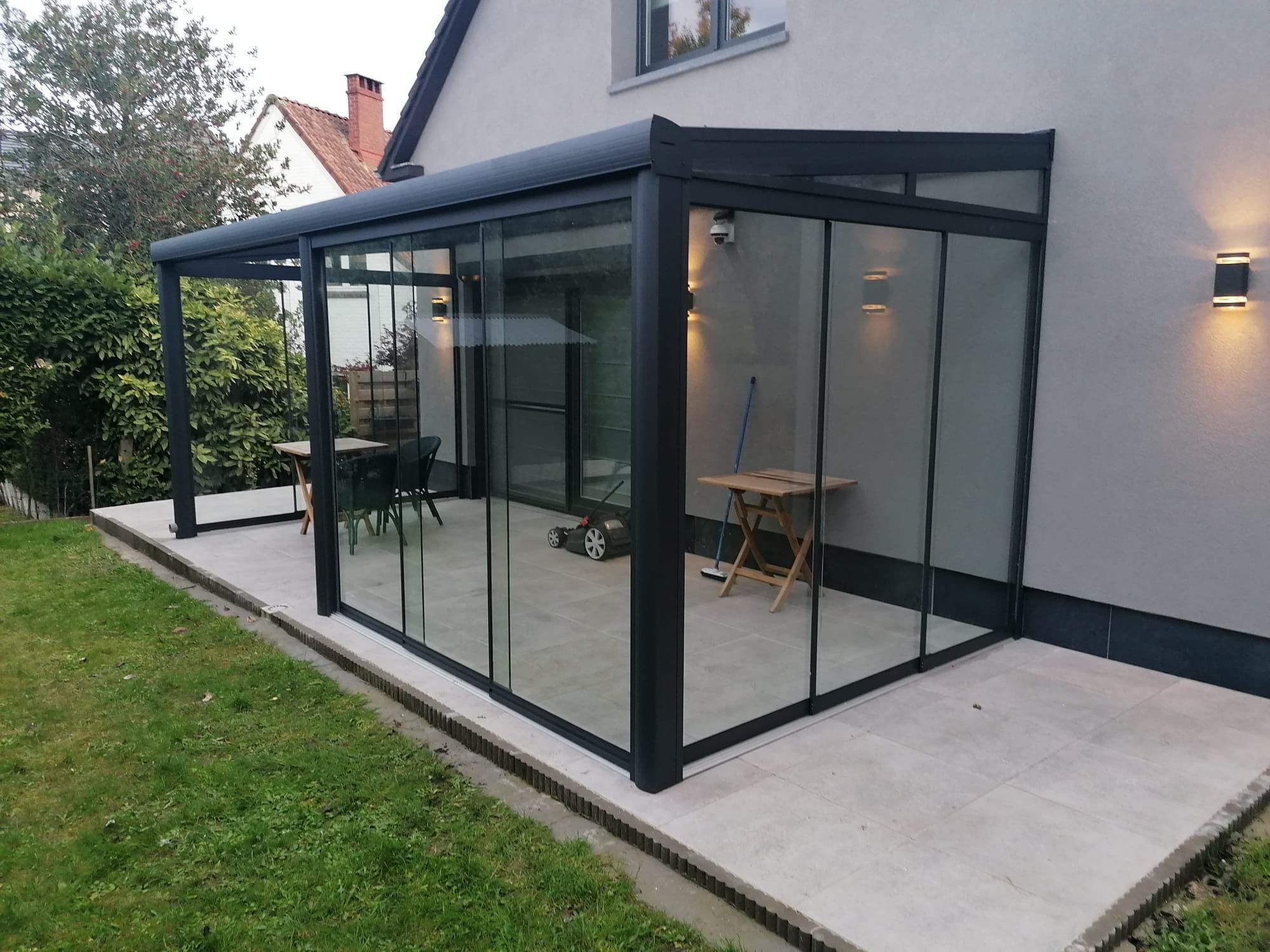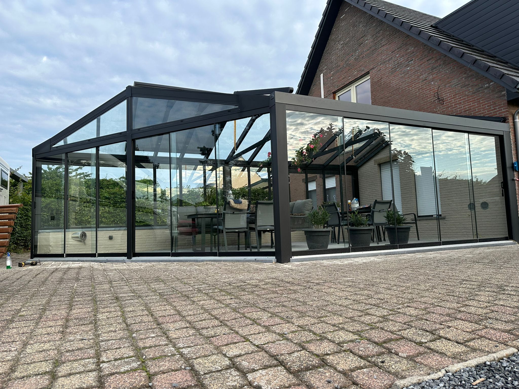 - Materiaal: Hoogwaardige aluminium constructie met polycarbonaat dak, bestand tegen verschillende weersomstandigheden.